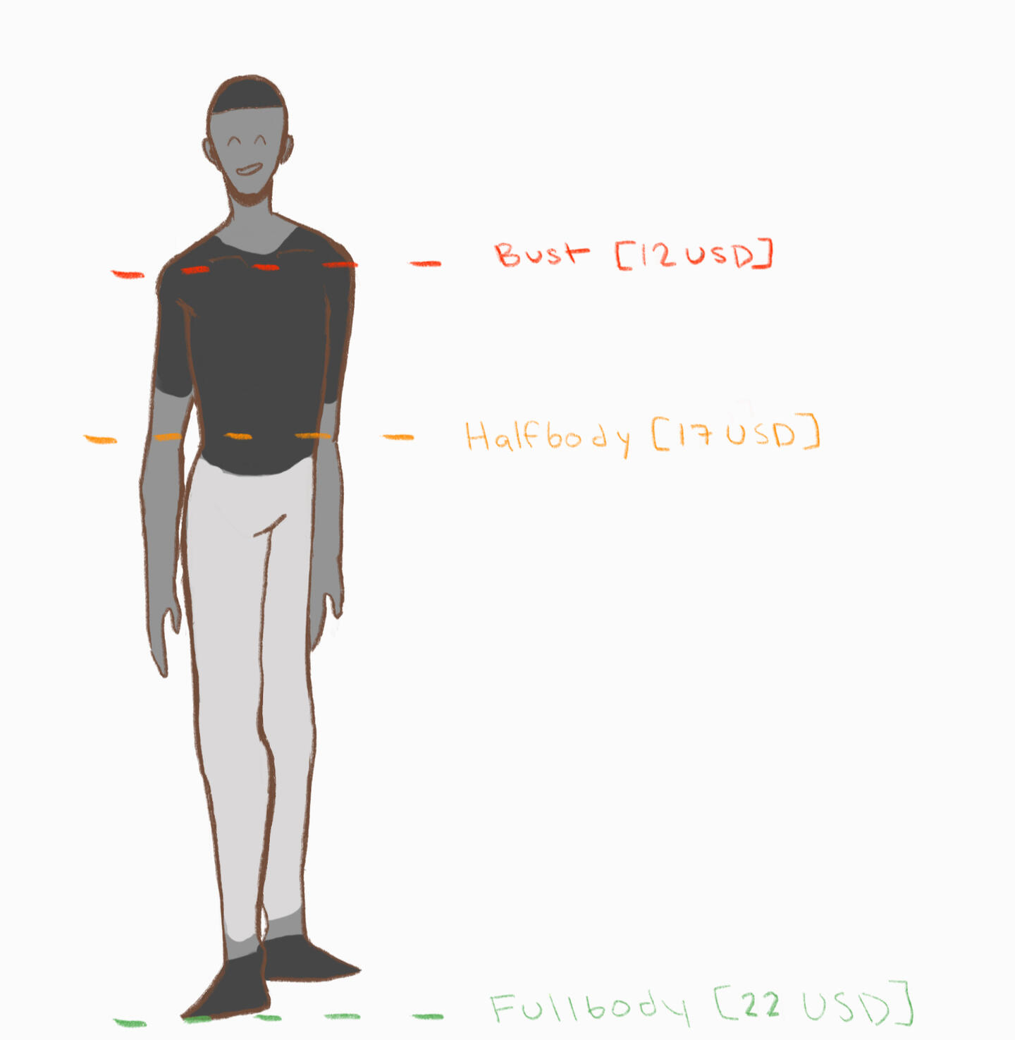 I offer 3 different types of general commissions (Lineart, Flat Color, and Rendered) as well as icons and animatics.Each general commission has separate tiers: Bust, Halfbody, and FullbodyIf you want an additional character added to your general commission, the cost will double (ex. if you purchase a $7 lineart bust of your character, adding an additional character will bring your total to $14).**additional character cost applies to pets as wellProps [ $3 per prop ] ---> Chairs, Camera, Weapon, etc.