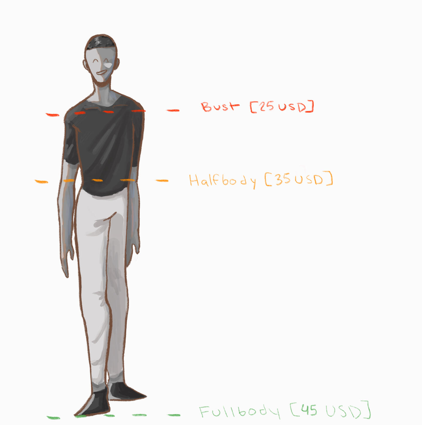 I offer 3 different types of general commissions (Lineart, Flat Color, and Rendered) as well as icons and animatics.Each general commission has separate tiers: Bust, Halfbody, and FullbodyIf you want an additional character added to your general commission, the cost will double (ex. if you purchase a $7 lineart bust of your character, adding an additional character will bring your total to $14).**additional character cost applies to pets as wellProps [ $3 per prop ] ---> Chairs, Camera, Weapon, etc.